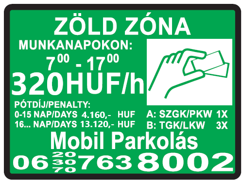 A parkoló zóna táblák területi hatálya alatt csak a Kresz által, és egyéb jogszabály által nem tiltott területen, a parkolójegy automatából megváltott érvényes jeggyel - vagy érvényes bérlettel vagy mobiltelefonos parkolással lehet parkolni.